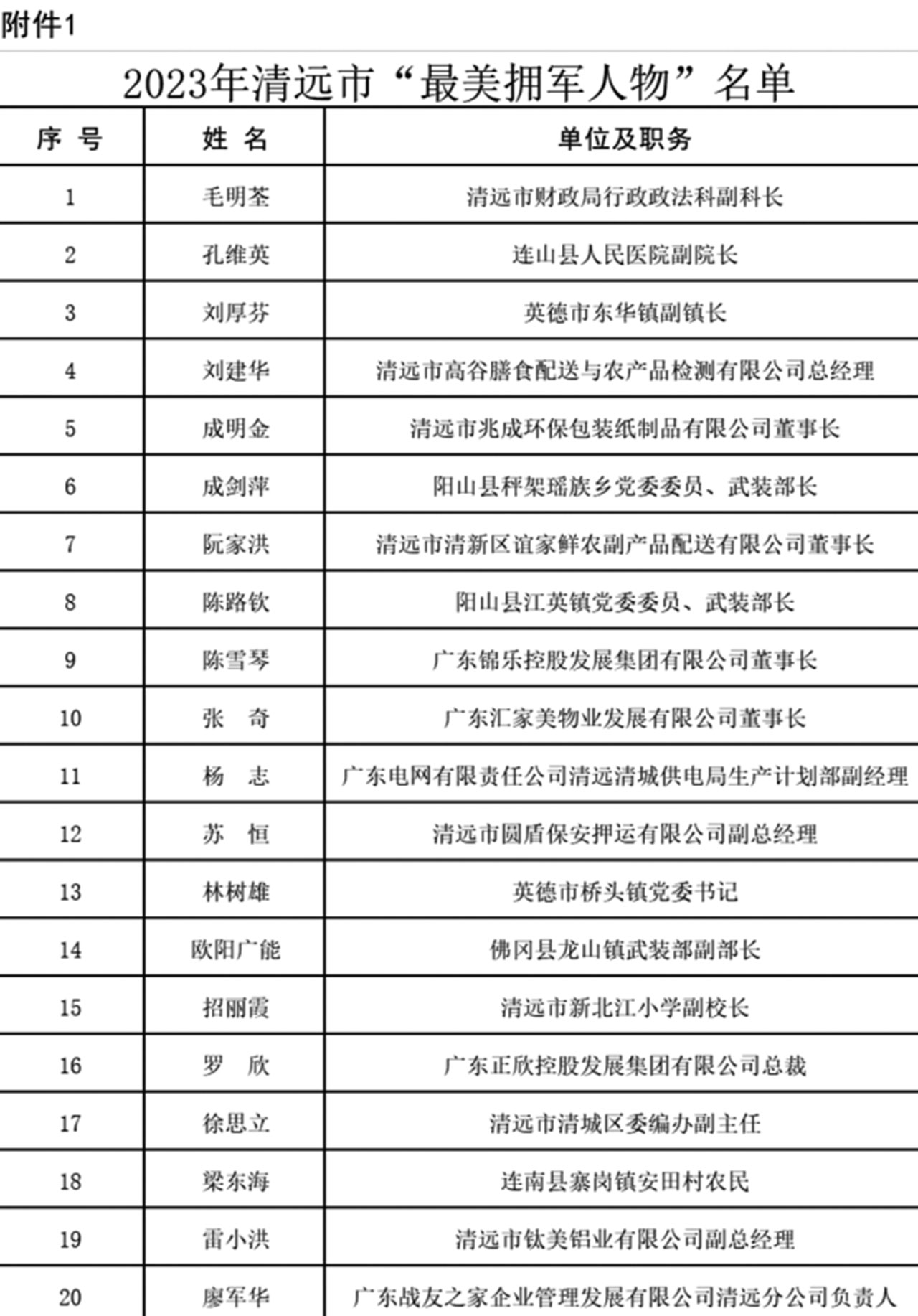 為激勵(lì)廣大干部群眾學(xué)習(xí)最美、爭當(dāng)最美,在全社會大力營造關(guān)心國防、尊崇軍人濃厚氛圍,營造立足崗位作貢獻(xiàn)、建功立業(yè)新時(shí)代的時(shí)代風(fēng)尚,清遠(yuǎn)市雙擁工作領(lǐng)導(dǎo)小組對毛明荃等20名“最美擁軍人物”、齊秀娟等10名“最美軍嫂”予以通報(bào)表揚(yáng)。