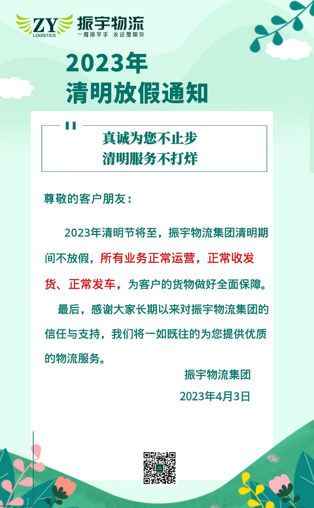 2023年清明節(jié)將至,振宇物流集團(tuán)清明期間不放假,所有業(yè)務(wù)正常運(yùn)營,正常收發(fā)貨、正常發(fā)車,為客戶的貨物做好全面保障。最后,感謝大家長期以來對振宇物流集團(tuán)的信任與支持,在此祝您度過一個愉快的假期。