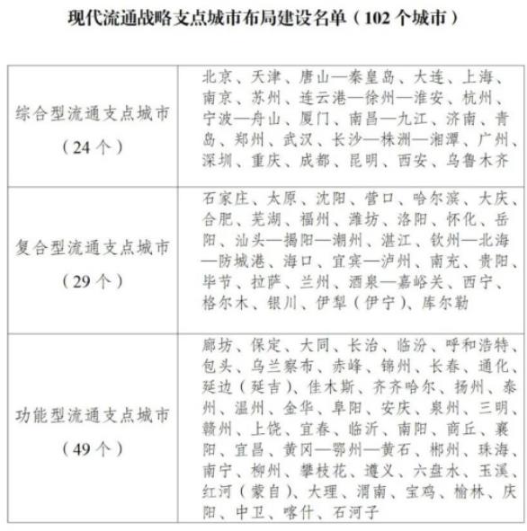 為貫徹黨的二十大報(bào)告有關(guān)部署、落實(shí)《“十四五”現(xiàn)代流通體系建設(shè)規(guī)劃》相關(guān)要求,推動(dòng)構(gòu)建高效順暢的現(xiàn)代流通體系,近日,國(guó)家發(fā)展改革委會(huì)同自然資源部、交通運(yùn)輸部、商務(wù)部、市場(chǎng)監(jiān)管總局印發(fā)《關(guān)于布局建設(shè)現(xiàn)代流通戰(zhàn)略支點(diǎn)城市的通知》,部署現(xiàn)代流通戰(zhàn)略支點(diǎn)城市布局建設(shè)工作。