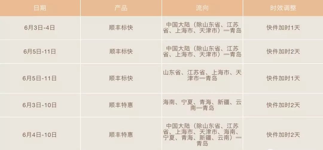 6月3日-11日,全網(wǎng)進(jìn)出青島流向的順豐次晨、即日、生鮮速配、部分醫(yī)藥冷運(yùn)等對(duì)溫度及時(shí)效要求較高的產(chǎn)品和冷藏冷凍件停收,物流普運(yùn)等重貨類產(chǎn)品停收(重貨快運(yùn)加時(shí)不停收)。