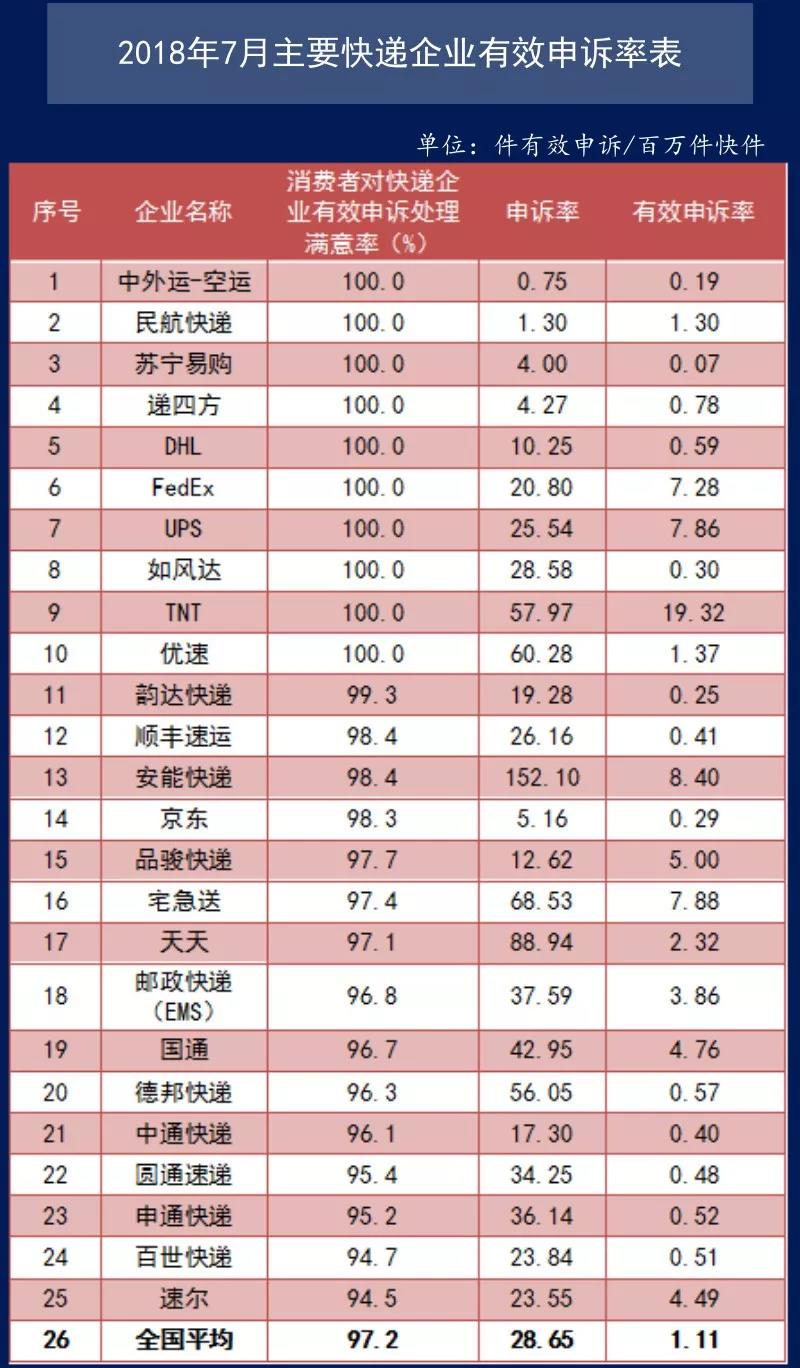 7月,消費者對快遞企業(yè)有效申訴處理滿意率(消費者對快遞企業(yè)有效申訴處理滿意件數(shù)與快遞企業(yè)有效申訴總量之比)為97.2%,低于全國平均有效申訴處理滿意率的快遞企業(yè)有9家。